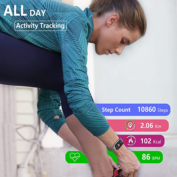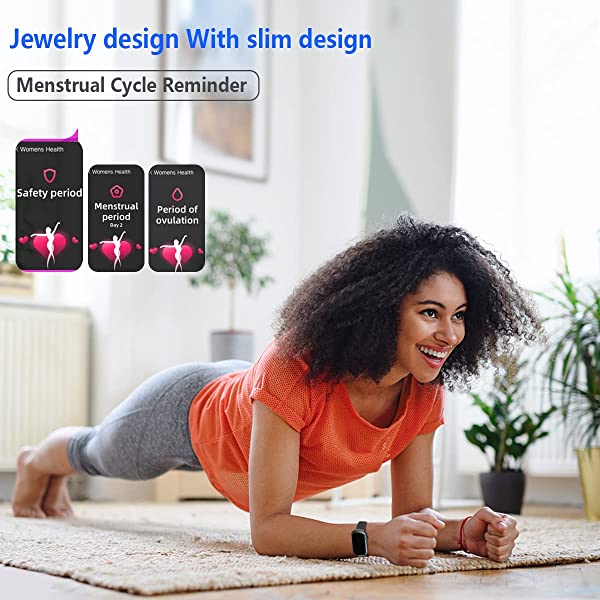 Smart Functions: An easy-to-use activity fitness tracker with 7 sports modes and various intelligent features. DIY watch face, call and message notifications, weather, drinking and sedentary reminder, alarm clock, music control, and female menstruation period reminder.