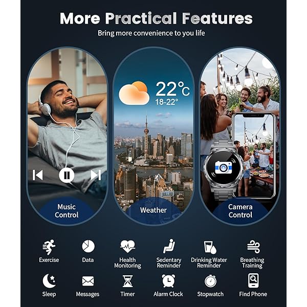 【2 straps & Multifunctional】:This round smart watch for men comes with two types of straps: a black stainless steel band, a black silicone band. The stainless steel strap is durable, easy to clean, and its metallic finish enhances a man's sophisticated style. The silicone strap is soft and skin-friendly. You can choose between the two styles as you like.This smartwatch features music control, remote camera, weather forecast, Bluetooth calling, message notifications, sports monitoring, sleep monitor,heart rate,etc., making it your best life assistant.