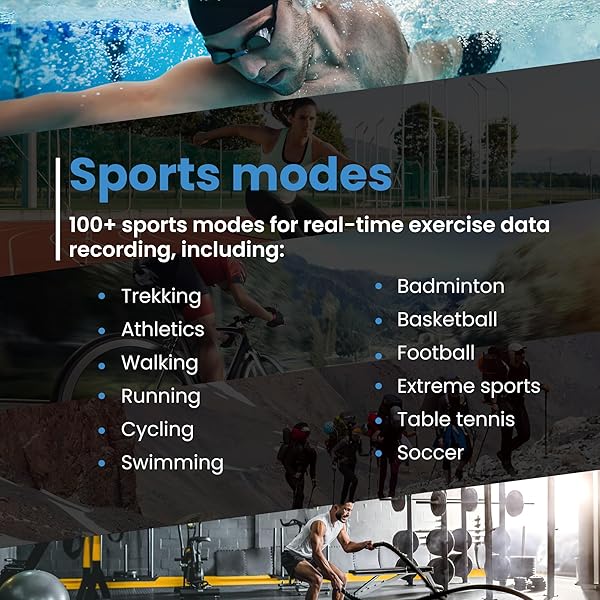 100+ sports modes for diverse activities: Track your workouts with a variety of sports modes! The Pro fitness tracker watch features over 100 sports modes to record real-time exercise data for activities like trekking, running, cycling, swimming, badminton, basketball, football, extreme sports and many more.