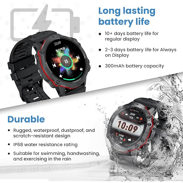 Rugged & durable design (IP68 waterproof): Built to withstand the elements, the Pro smartwatch is crafted with a sturdy structure. It's IP68 rated, making it waterproof, dustproof, shockproof, and functions in extreme temperatures. The scratch-resistant display ensures your step tracker watch stays looking its best, allowing you to wear it worry-free while swimming, washing your hands, or exercising in the rain.