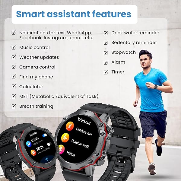 Smart assistant & convenient features: The Pro running watch is equipped with an AI voice assistant for added convenience. Receive notifications for texts, social media updates, emails, and more. Control your music playback, check the weather, remotely control your phone's camera, activate the "find my phone" function, use the built-in calculator, and access additional features like MET (Metabolic Equivalent of Task) readings, breath training exercises, hydration reminders and more.