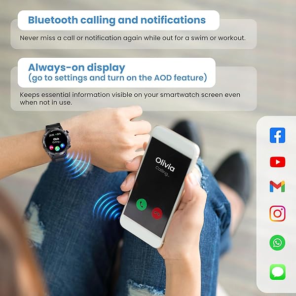 Effortless bluetooth calling & notifications: Stay connected on-the-go! This fitness watch allows you to make and receive calls directly on your wrist. It also displays notifications for SMS, WhatsApp, Facebook, Email, LinkedIn, Instagram, and Twitter, keeping you informed without needing to reach for your phone.
