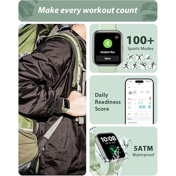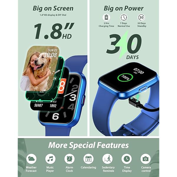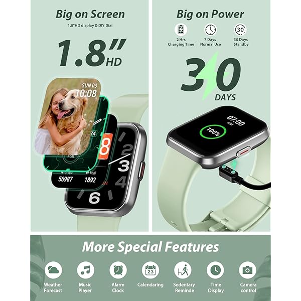 【Smart Life Partner & DIY Background】Multi-functional Smart Watch with 1.8"HD Extra-large full touch screen brings you a unique visual and better interactive experience. You can upload your favorite pictures as your watch faces. It contains many daily useful tools, such as Noise monitoring, Message reminder, Weather forecast, Music control, Stress monitoring, Setting alarms, Stopwatch, timer, Sedentary reminder, Breather guide, Raise to wake, Find phone, adjustable brightness and more.
